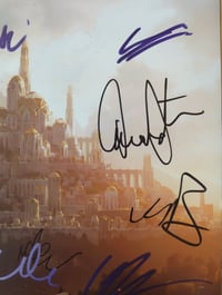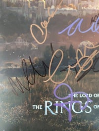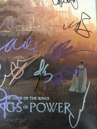 The Rings of Power cast piece signed by 15 cast & crew in silver,bronze,purple and black pens by the following